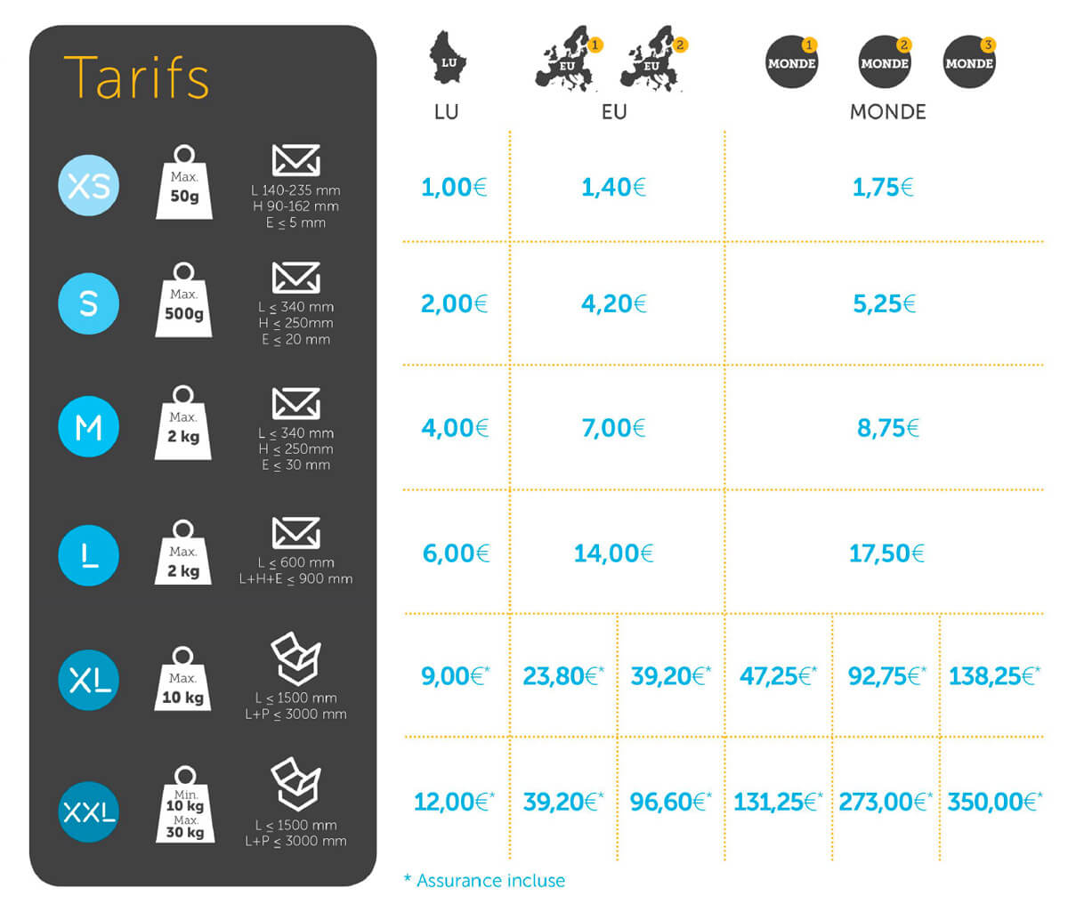 The list of countries by zone is available at www.post.lu